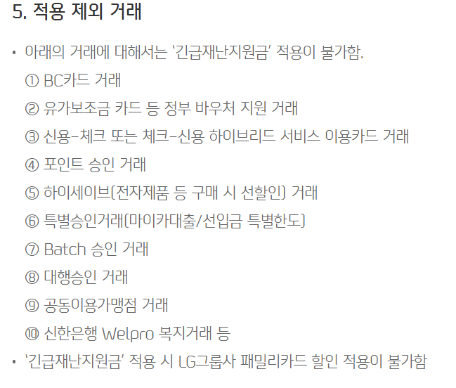 적용제외거래 신한카드로 재난지원금을 받아 사용하는데 포인트 승인이나 대행 승인, 바우처 지원 거래 등을 하면 적용이 안된다고 합니다. 따라서 사용하기 전에 한 번씩 확인을 해야겠습니다.