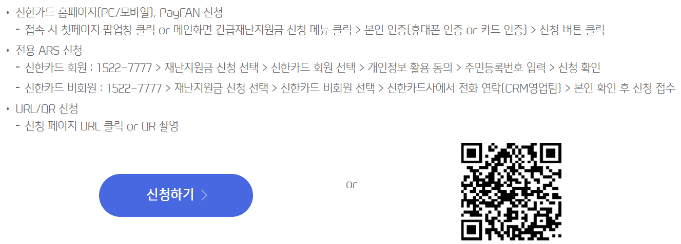 - 신한카드 회원 : 1522–7777 > 재난지원금 신청 선택 > 신한카드 회원 선택 > 개인정보 활용 동의 > 주민등록번호 입력 > 신청 확인