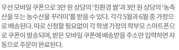 학부모는 7월 유효기간 내에 4만 원의 꾸러미 쿠폰을 활용하여 농협 몰에서 필요한 식자재를 구입할 수 있습니다.