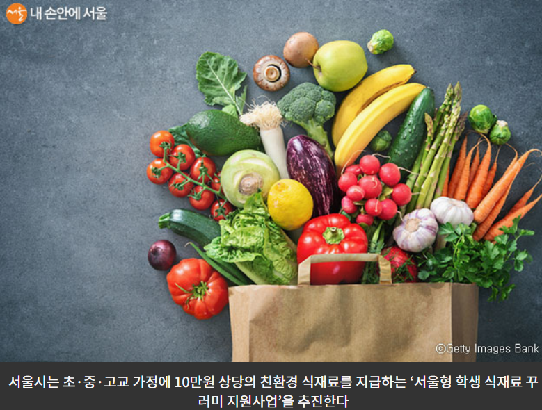 안녕하세요. 서울시에서는 모든 초중고교 가정에 친환경 식재료를 지급하는 서울형 학생 식재료 꾸러미 지원사업을 추진한다고 밝혔습니다.