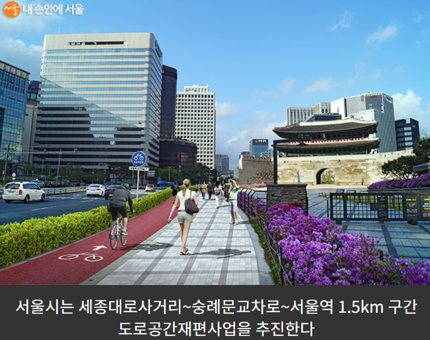 서울시는 5월 착공하여 올해 말 완공을 목표로 세종대로 사거리~숭례문 교차로~서울역 교차로 1.5k 구간의 도로공간 재편사업을 추진하고 있습니다.
