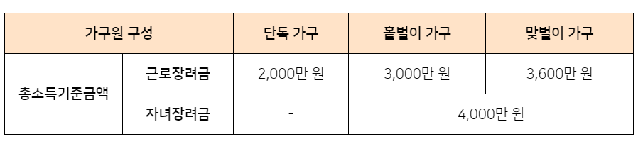 소득요건 근로장려금은 홑벌이가구, 맞벌이 가구에 따라 소득기준이 달라지지만 자녀장려금의 경우는 부부합산 총 4000만 원 미만이면 됩니다.