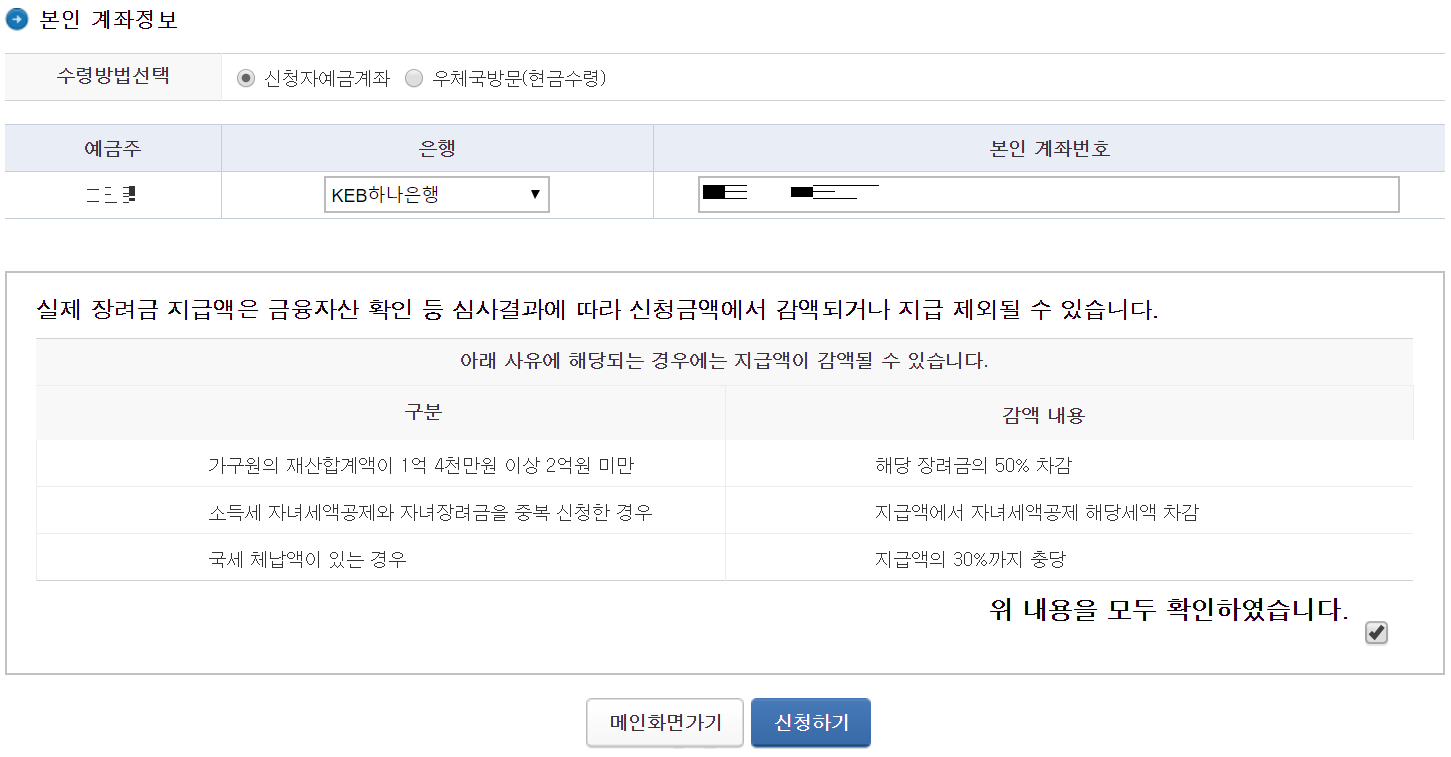 금액확인 후 계좌확인 기존에는 내가 스스로 계산하여 자격조건을 따져야 했다면 지금은 1차적으로 안내가 와서 참 편리해진 거 같습니다.