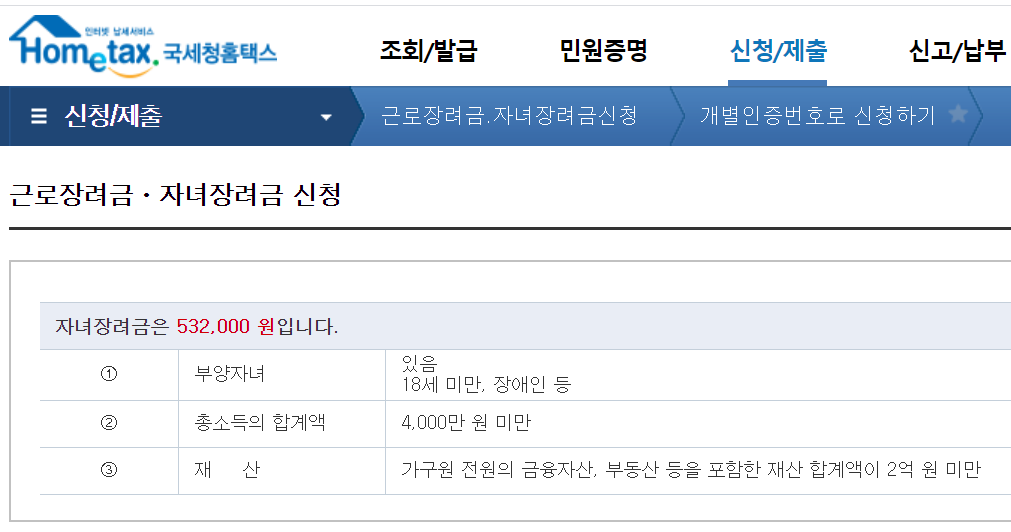 신청화면 조회 부양자녀가 1인 있는 가구의 경우 직접 신청을 해보니 532,000원을 받는다고 계산까지 되어서 나옵니다.