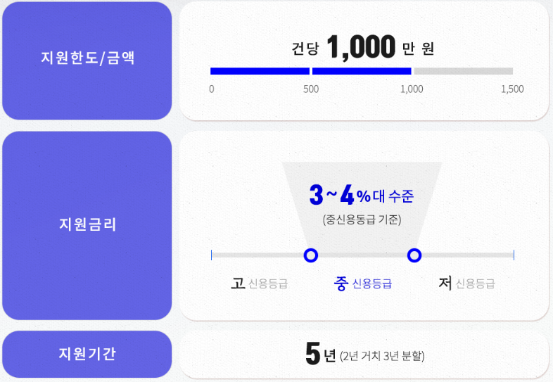 지원한도와 금리 /ktv 지원한도는 소상공인당 1000만 원까지 중간 신용등급을 기준으로 3~4%대 금리로 지원이 되며 2년 거치 3년 분할로 5년 동안 이용할 수 있습니다.