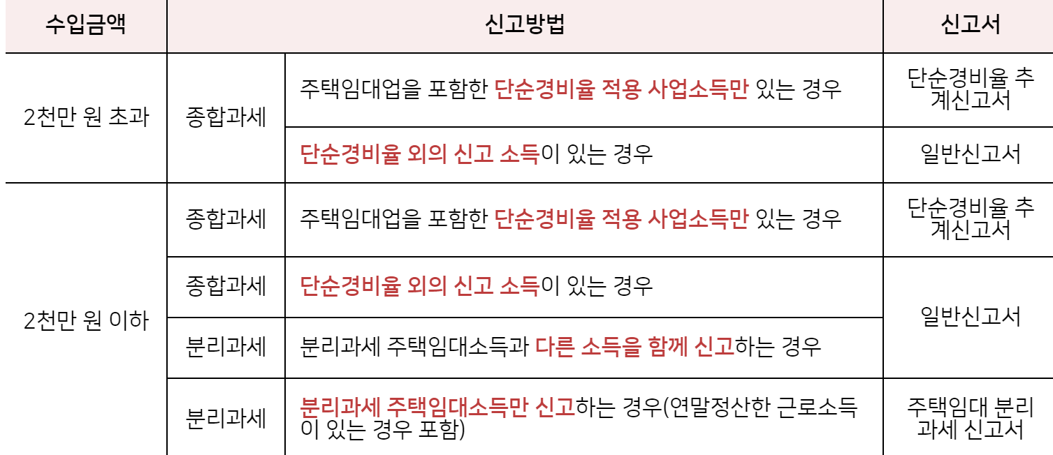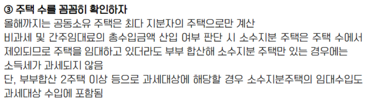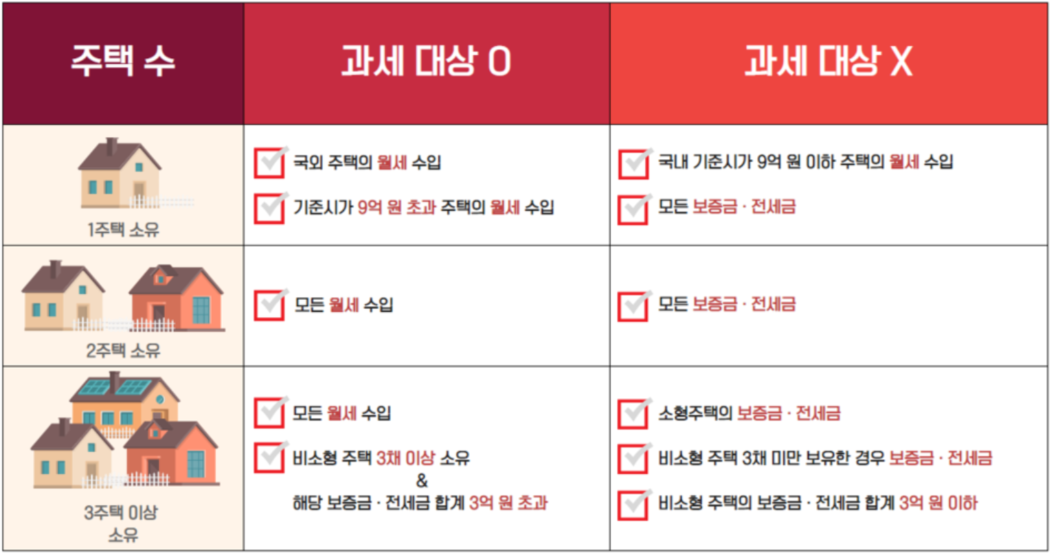 (2) 2 주택자 : 전세는 제외하고 주택 가격 상관없이 월세 소득이 있다면 반드시 종합소득세 신고를 해야 합니다.