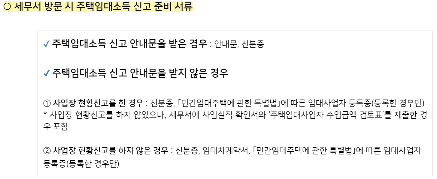 세무서 방문시 준비서류 / 국세청 세무서를 방문 시 주택임대소득 신고에 대한 준비서류는 다음과 같습니다.