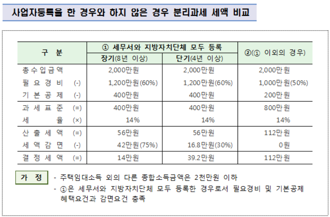 세액 비교/ 국세청 세무서와 지방자치단체 모두 사업자등록을 마친 임대사업자라면 필요경비 및 기본공제혜택을 둘 다 받을 수 있어 임대소득 절세가 가능합니다.