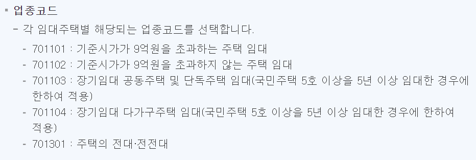 업종코드 기본적으로 701102인 기준시가가 9억 원을 초과하지 않는 주택 임대 코드를 사용하겠죠.