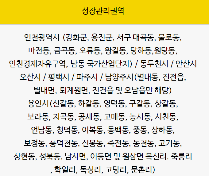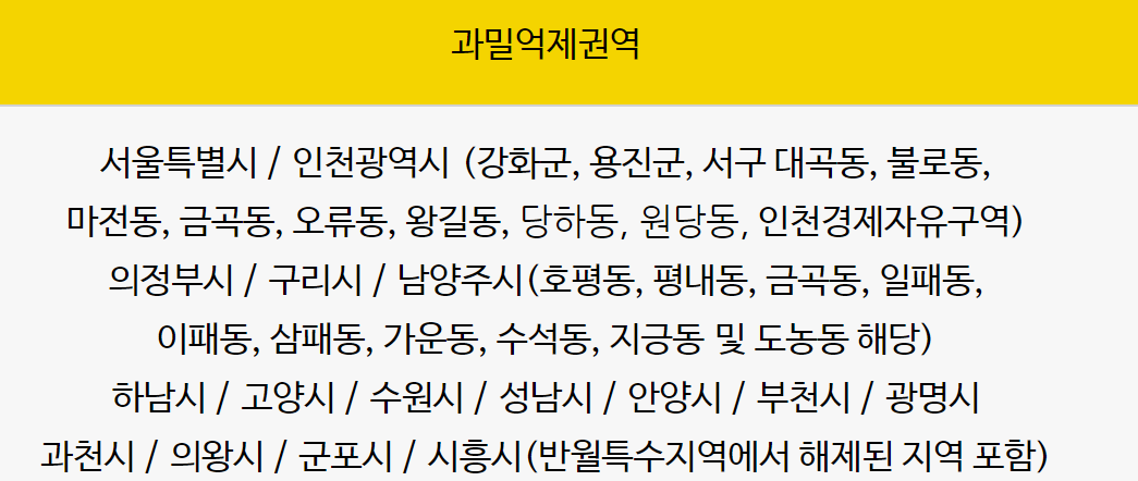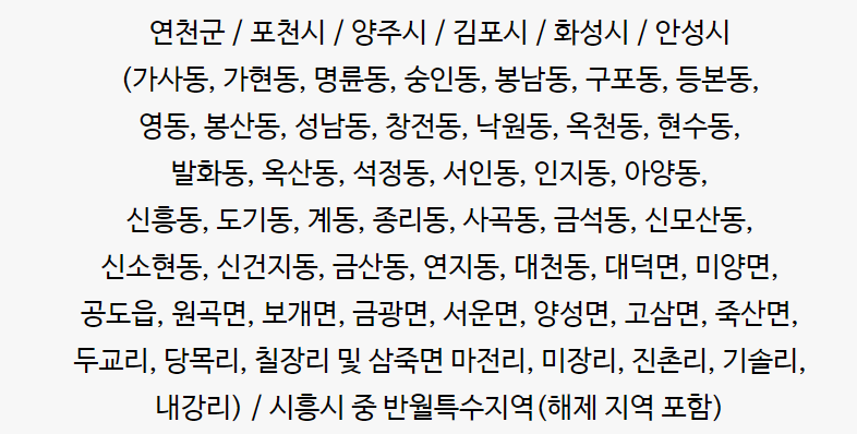: 서울특별시, 인천일대 , 의정부, 구리, 남양주 일대, 하남시, 고양시, 수원시, 성남시, 안양시, 부천시, 광명시, 과천시, 의왕시, 군포시, 시흥시 일대가 있으며 기존 제한대상 수도권 지역입니다.