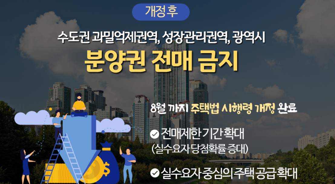수도권 과밀억제권역, 성장관리권역, 광역시에 대해서는 분양권 전매금지가 소유권이전등기시점까지 분양권 전매제한이 강화됩니다.