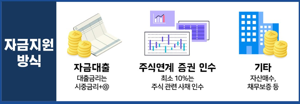 자금지원 방식 / 금융위 자금지원 방식에는 직접적으로 대출해주거나 주식연계 증권을 인수 또는 자산 매수, 채무보증 등을 통해 경영상 필요한 자금을 지원해주기로 했습니다.