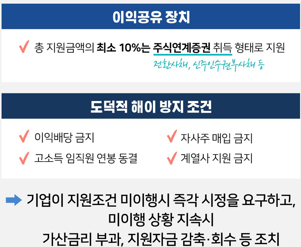 조건2/ 금융위 또한 이익공유장치를 마련하고 도덕적 해이 방지 조건인 이익배당금지, 자사주 매입 금지, 고소득 임직원 연봉 동결, 계열사 지원 금지의 의무를 지켜야 합니다.