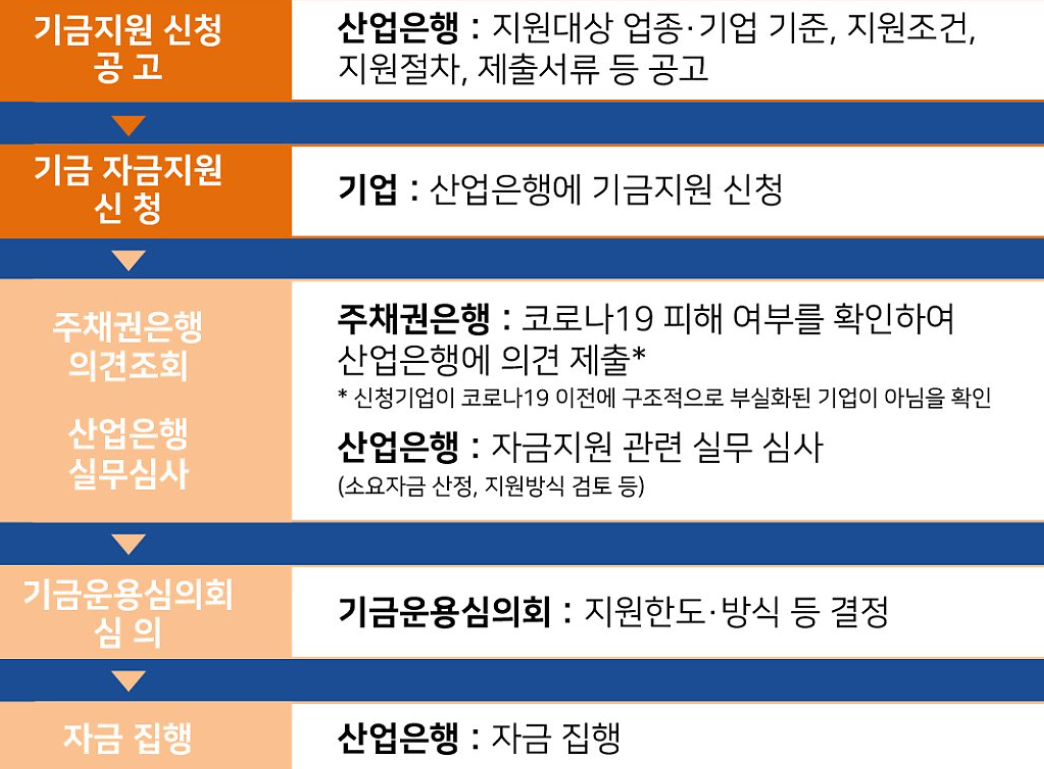 절차 과정 . 금융위 신청기업이 코로나 19 이전에 구조적으로 부실화된 기업인지 아닌지도 은행에서 확인하고 최종적으로 기금운용심의회를 거쳐 해당 기업에 대한 지원이 제공됩니다.
