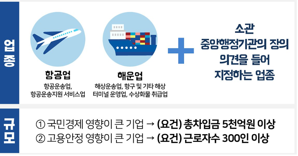 업종 및 규모 / 금융위 지원업종으로는 항공업(항공운송 및 지원서비스업), 해운업(해운 운송 및 터미널 운영업, 수상화물 취급업)이 속하며 그밖에는 중앙행정기관의 장의 의견을 들어 지정하기로 하였습니다.