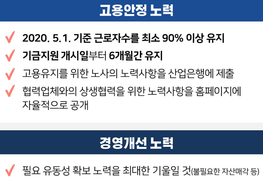 최소 기금 지원 개시일로부터 90% 이상 근로자수를 5개월간 유지해야 하며 노사협력의 노력 방안을 마련해야 합니다.