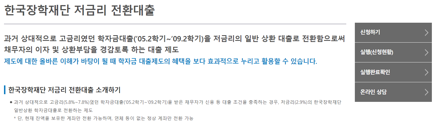 반드시 한국장학재단 홈페이지(바로가기)를 통해서 한국장학 재단 저금리 전환대출을 신청해야 합니다.