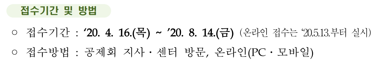 접수기간 및 방법 ▷접수기간 : 2020년 4월 16일 ~ 2020년 8월 14일까지