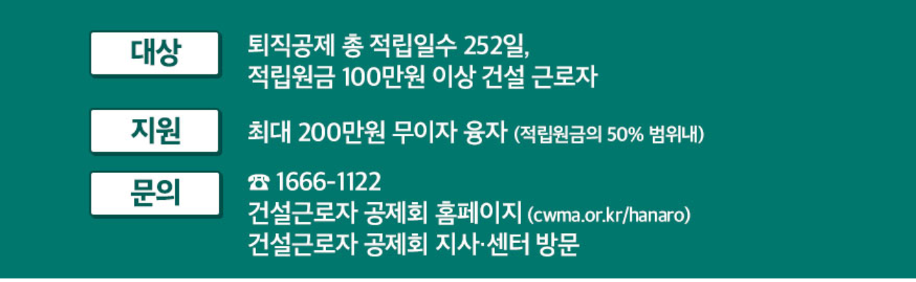 일용직 건설근로자의 생활을 보호하기 위해서 건설근로자공제회에서 무이자로 생활비를 지원해준다고 하니 어려운 시기에 적절하게 활용한다면 도움이 정말 되겠습니다.