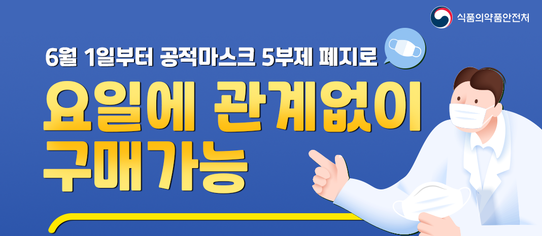 식품의약품안전처 ▼공적 마스크5부제 폐지에 따라 언제든 구입 가능