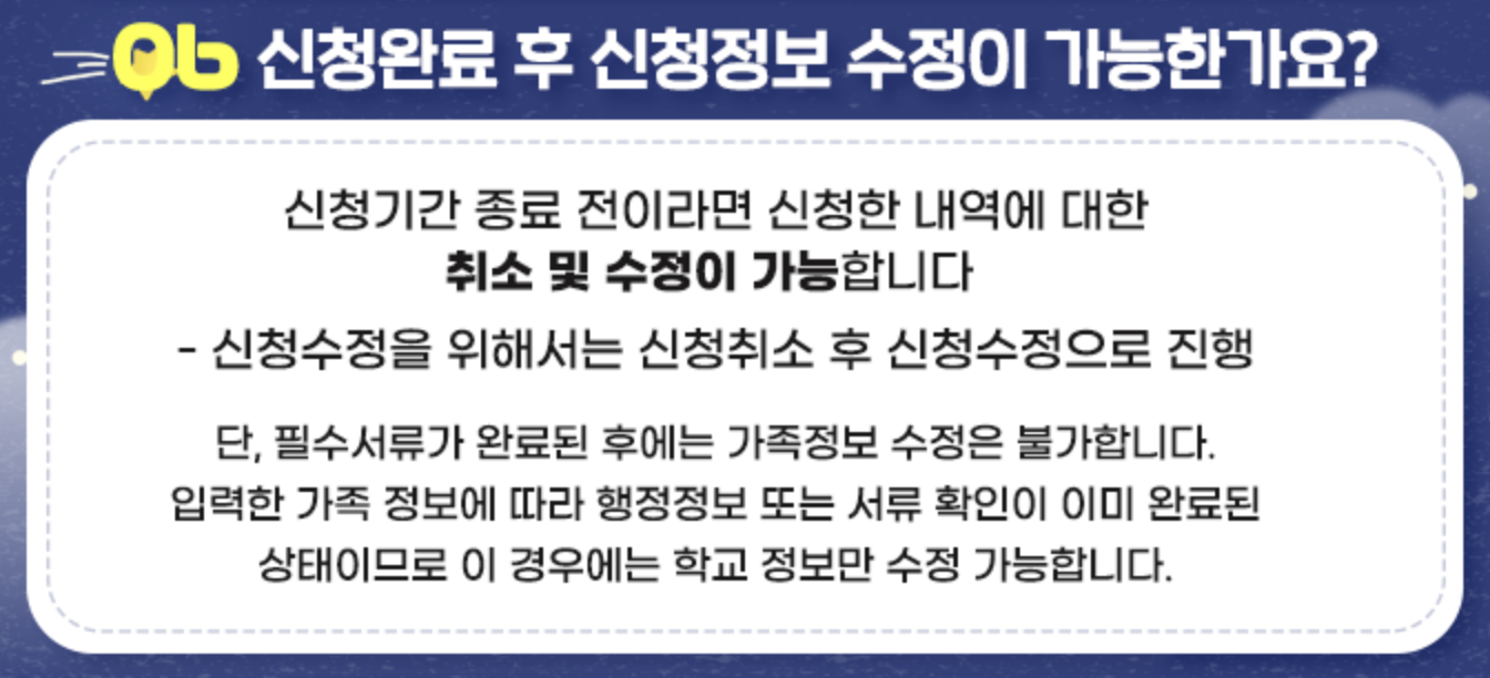 A. 신청기간 종료 전이라면 언제든 취소와 수정이 가능합니다.