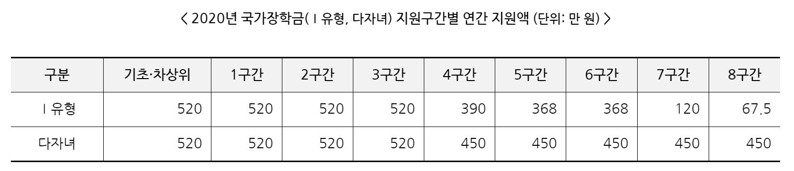 소득인정액 기준 /교육부 블로그 소득인정액을 기준으로 8구간까지 나누었을 때 학생에게 국가장학금으로 연 520만 원~67만 5천 원 범위 내에서 차등적으로 지원을 하고 있습니다.