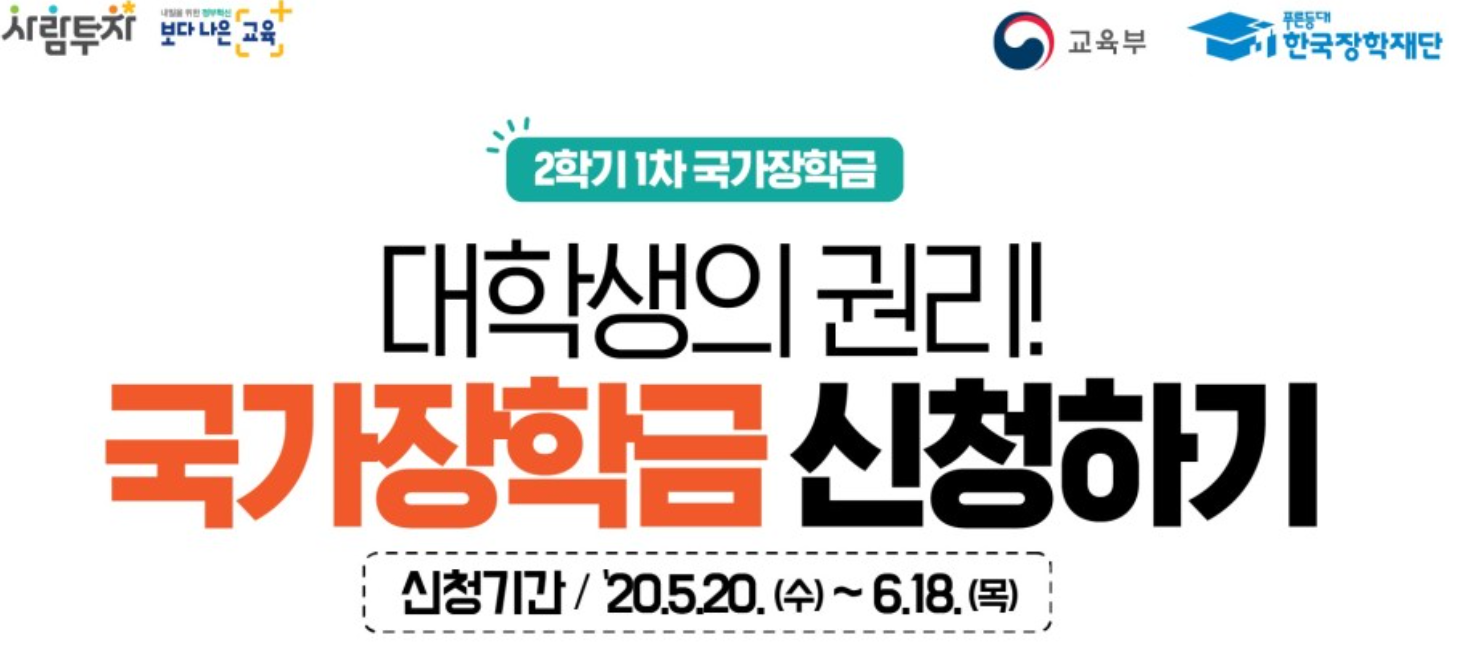 20년 5월 20일 수요일 ~ 6월 18일 목요일까지 국가장학금 2학기 신청을 할 수 있습니다.