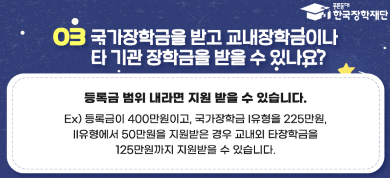 한국장학재단 Q. 국가장학금과 교내 장학금이나 타기관 장학금 중복 수령이 되나요?