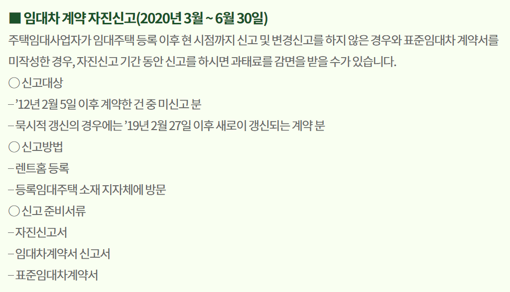 자진신고기간 특히나 2019년 2월 27일 이후 일어난 묵시적 갱신의 경우에 대해서 표준임대차 계약서를 작성하기 전이지만 자진신고를 하면 면제가 됩니다.