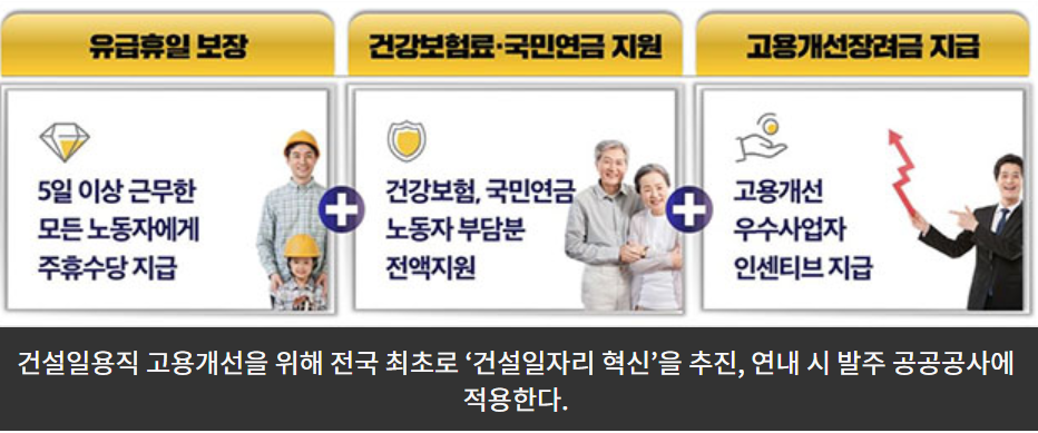 건설일자리 혁신 ▶5일 일하면 주휴수당 필수로 지급하며 표준 근로계약서를 의무화합니다.