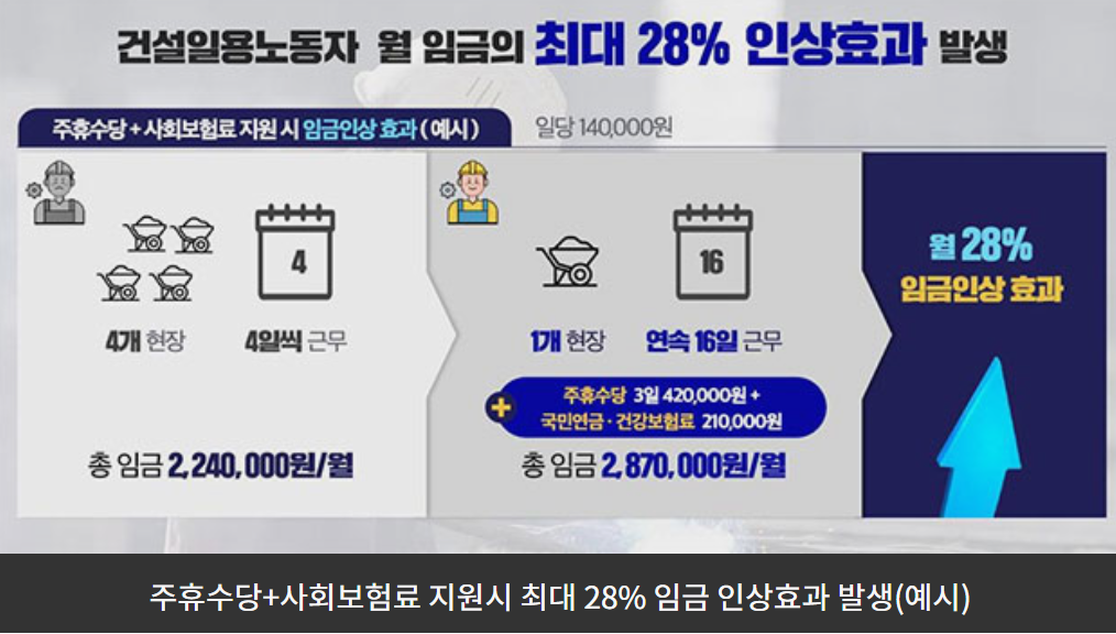 이를 통해 한 달 보통 16일간 현장에서 근무를 한 건설노동자당 약 28%의 임금 효과를 받게 될 것으로 분석했습니다.