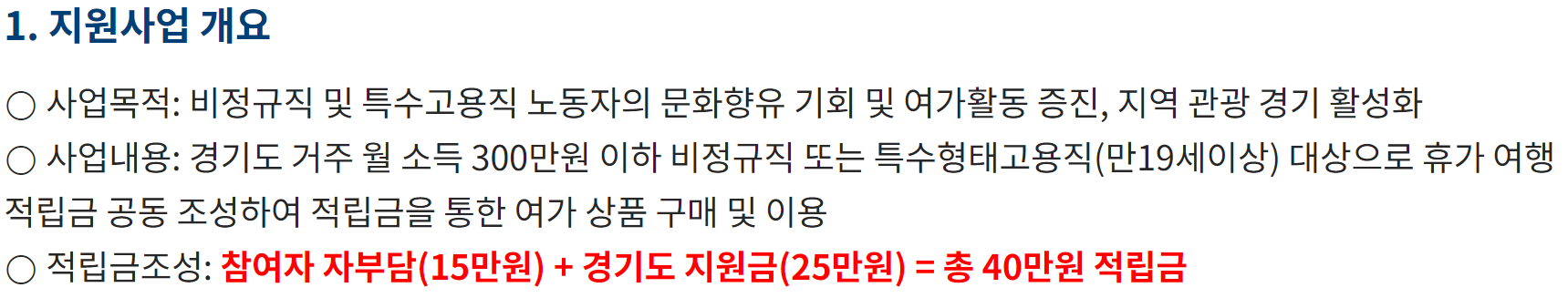 휴가비 지원사업 개요 총40만원의 적립금이 주어지는데 이중에서 참여자는 15만원의 자부담을하면 나머지 25만원을 경기도에서 지원해주는 형식입니다.