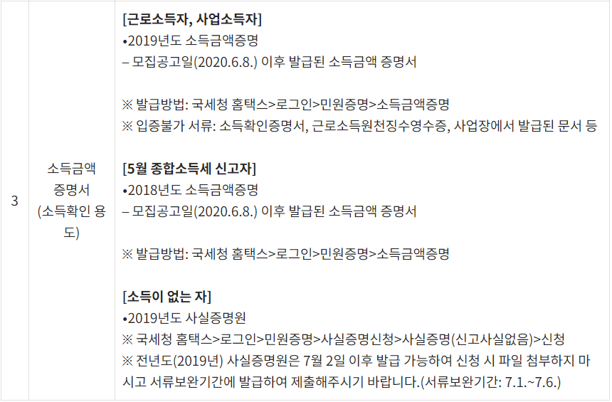 근로 및 사업소득의 경우에는 2019년도분, 5월 종합소득세 신고자는 2018년도 소득금액증명원을 준비하면 되겠네요.
