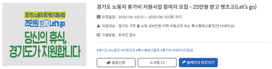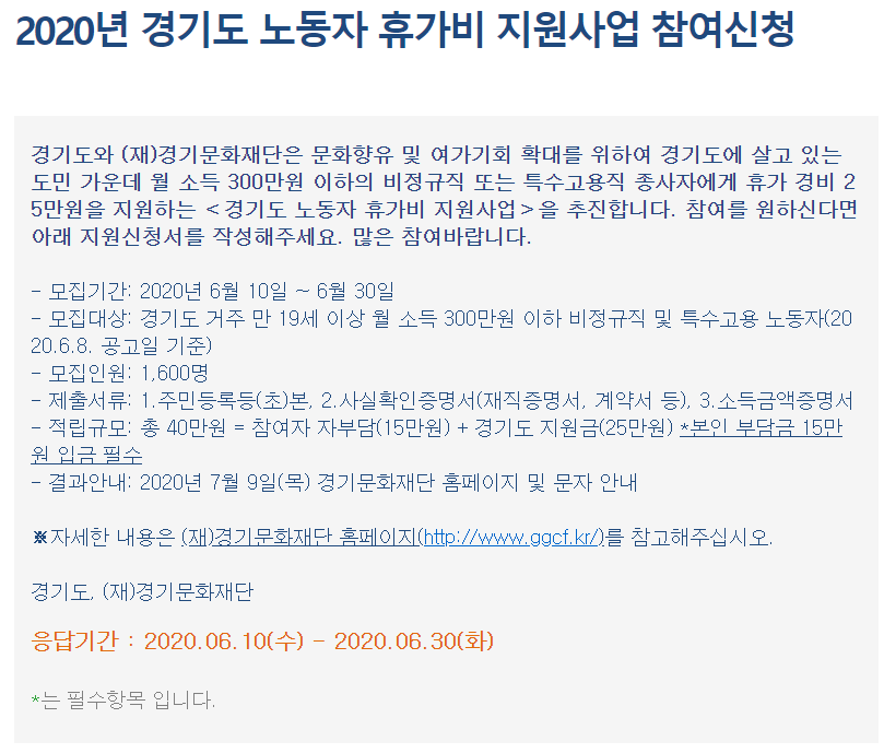 경기도에 살고 있는 도민 가운데 월 소득이 300만원 이하의 비정규직 또는 특수형대고용직 종사자(프리랜서 등)에게 휴가 경비 25만원을 지원하는 사업입니다.