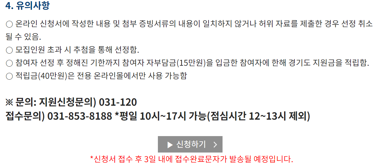 유의사항 신청 뒤 선정될 경우에는 나중에 경기도 휴가비사용 전용 온라인몰을 통해서만 사용가능하다는 사실을 염두해 두셔야겠습니다.