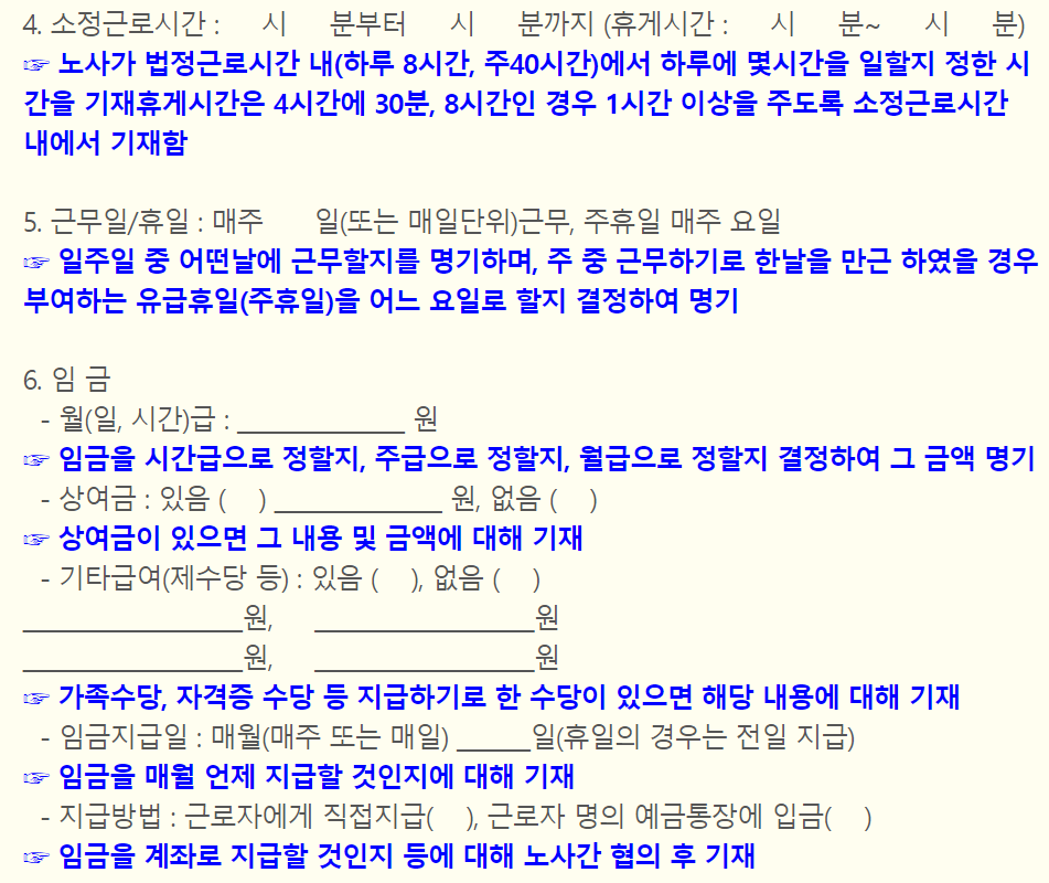 (6) 임금의 경우 시급, 주급, 월급으로 할지 명기하고, 상여금 및 기타 수당 내용을 확실히 기재해야 합니다.