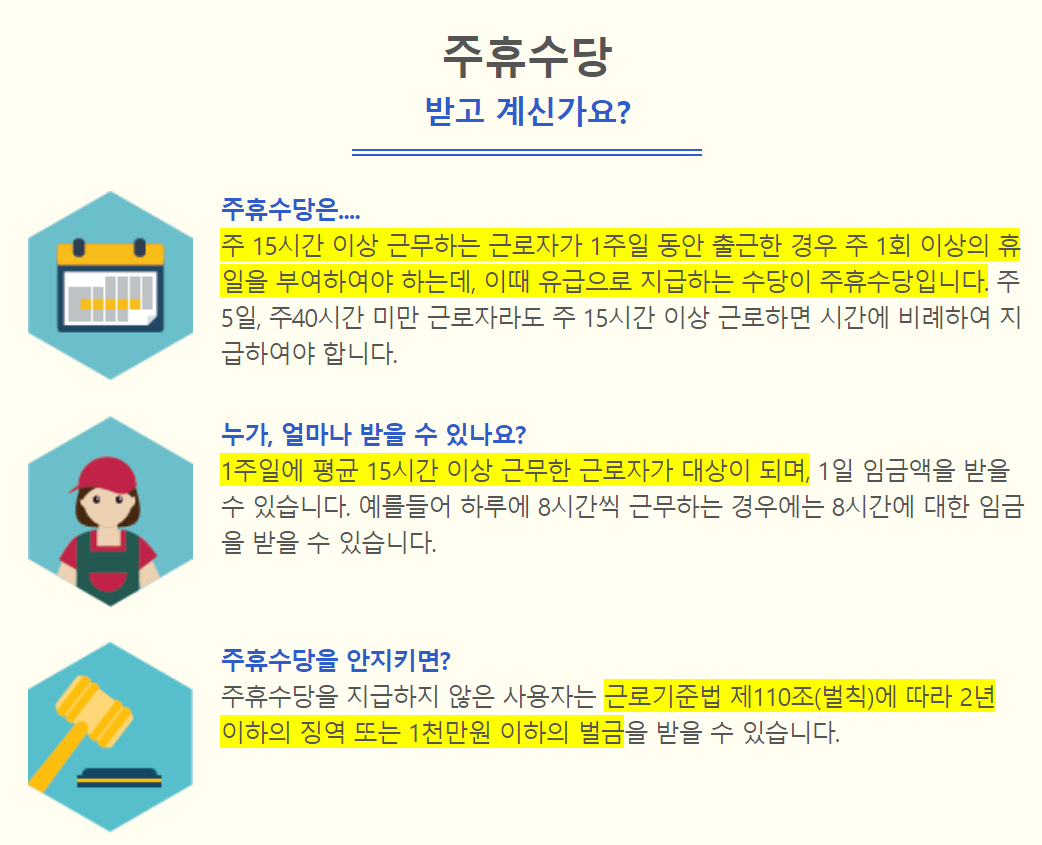 만약 주휴수당을 지키지 않을 경우 2년 이하의 징역 또는 1천만 원 이하의 벌금을 물게 됩니다.