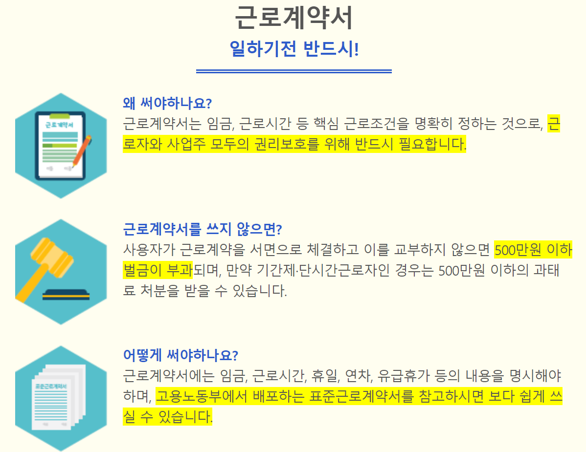고용노동부 근로계약서 반드시 작성 권고 근로계약서를 쓰지 않는다면 특히 노동자의 경우 자신의 권리를 지키는 데 굉장히 불리하므로 반드시 작성해야합니다.