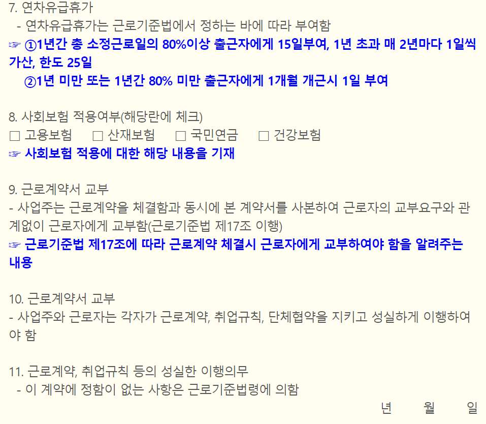 표준근로계약서 작성방법 셋 (7) 연차 유급휴가로 근로기준법에 따라 1년간 총 소정근로일의 80% 이상 출근자에게 15일 부여, 1년 초과 매 2년마다 1일씩 가산하며 최대 25일까지 입니다.