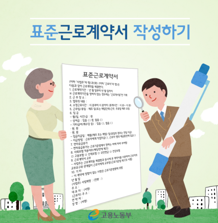 고용노동부에서 제공하는 표준근로계약서 무료 양식을 바탕으로 작성방법 및 근로자가 챙길 수 있는 권리를 자세히 알아보도록 하겠습니다.