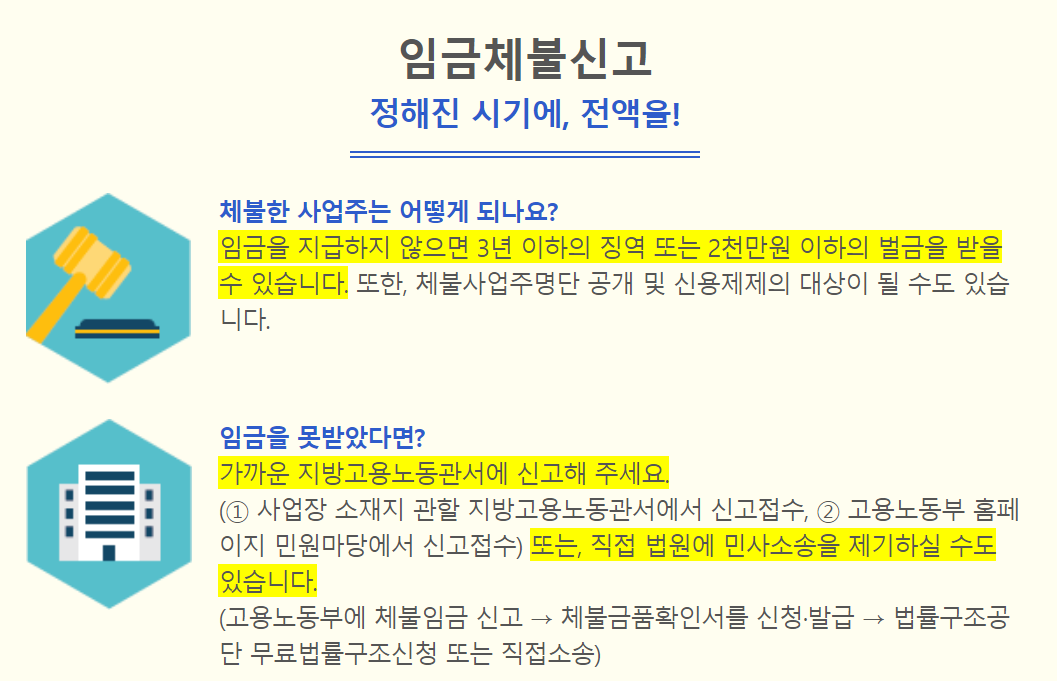 신고바로하기 임금체불신고(온라인 신고 바로가기)고용노동부 민원마당에서 온라인으로도 가능하며 소액체당금 지원제도를 통해 체불임금 소송에서 승소한 근로자에게 정부가 우선 월급을 주는 제도도 있으니 이용할 수 있습니다.