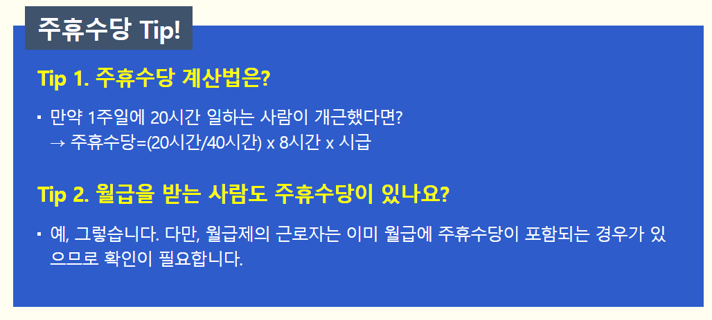 주휴수당이란? 주휴수당이란 1주일에 평균 15시간 이상 근무한 근로자를 대상으로 지급되는 유급휴일에 대한 수당을 말합니다.