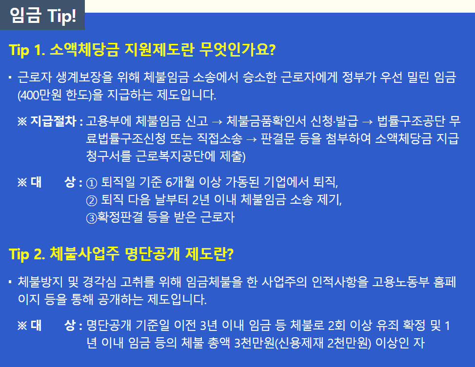 신고바로하기 임금체불신고(온라인 신고 바로가기)고용노동부 민원마당에서 온라인으로도 가능하며 소액체당금 지원제도를 통해 체불임금 소송에서 승소한 근로자에게 정부가 우선 월급을 주는 제도도 있으니 이용할 수 있습니다.