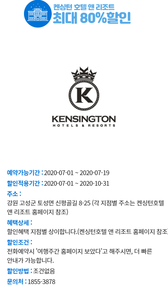 켄싱턴호텔, 한화리조트, 오크밸리리조트 등 다양한 곳에서 특별여행 주간 기간동안만 할인권을 제공하고 있습니다.