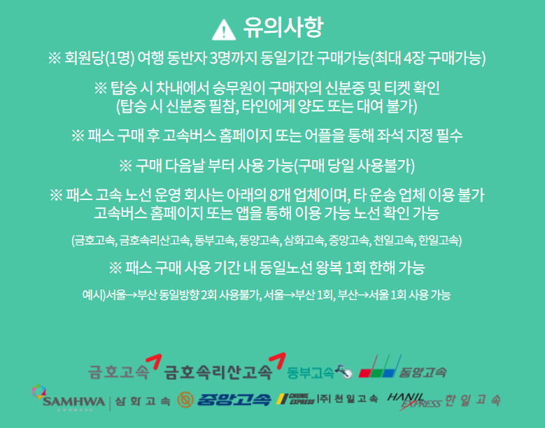 *패스 사용은 동일노선 왕복 1회 한해만 사용할 수 있으며 서울에서 부산 가는 데만 이용은 안되니 유의해야겠습니다.