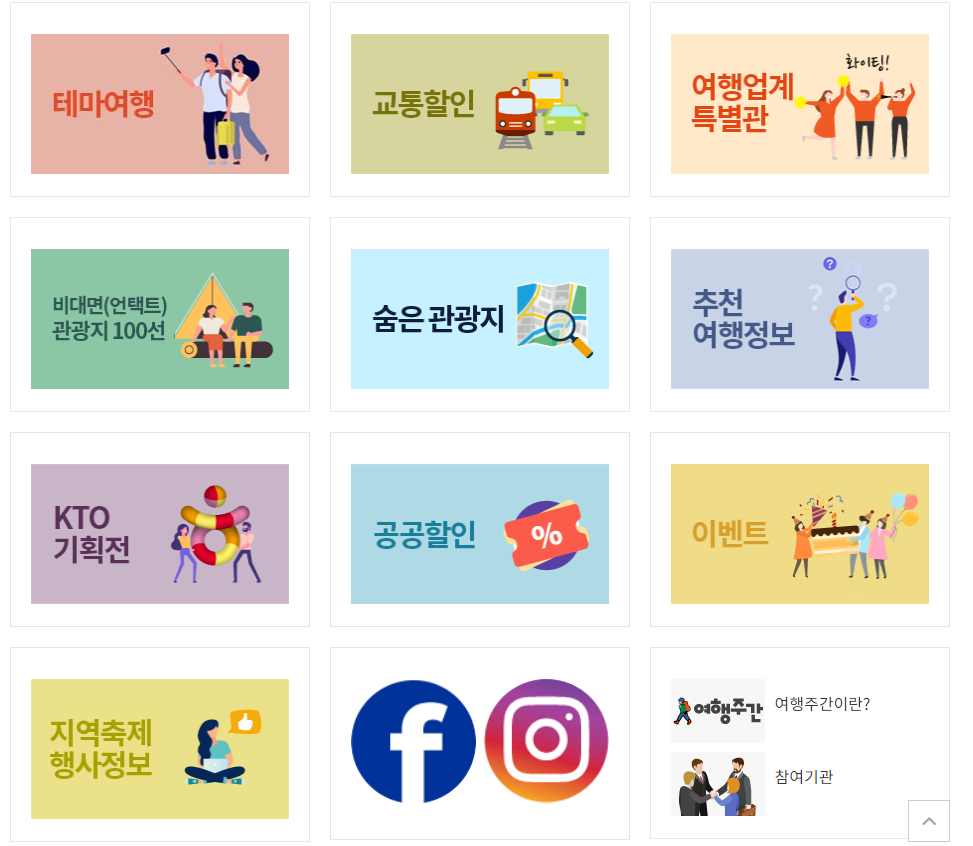 여행주간 홈페이지 여행주간 홈페이지에 들어가면 테마여행, 비대면 관광지100선, 지역축제 행사정보 등 다양한 여행지에 대한 정보를 한눈에 살펴볼 수 있습니다.
