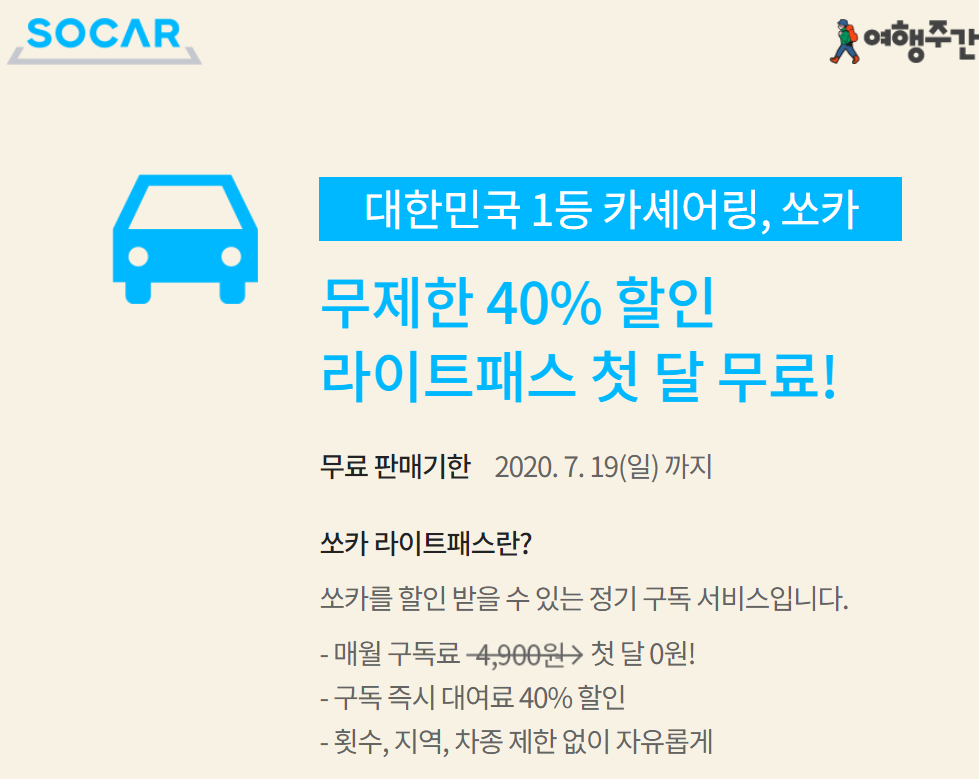 여행주간 고속버스 할인 이밖에도 쏘카 라이프패스권이 한달무료라 여행지에서 쏘카대여를 40% 할인받아 이용할 수 있습니다!