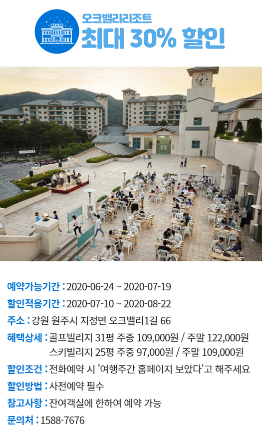 오크밸리리조트 할인쿠폰 홈페이지가 아닌 전화예약을 통해서는 반드시 여행주간 홈페이지에서 보았다고 먼저 이야기를 해주시면 할인된 비용을 자동으로 적용해준다고 하니 꼭 말해야겠습니다.