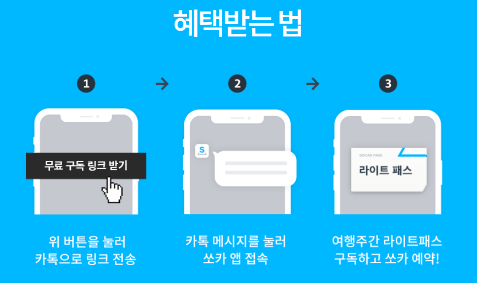 쏘카 라이트 패스 무료 이용 다만 쏘카 앱으로 들어가면 여행 주간 이벤트가 보이지 않으니 반드시 전송받은 카톡 메신저로 쏘카를 접속해야 합니다.