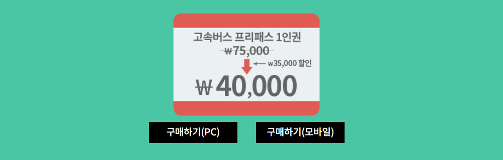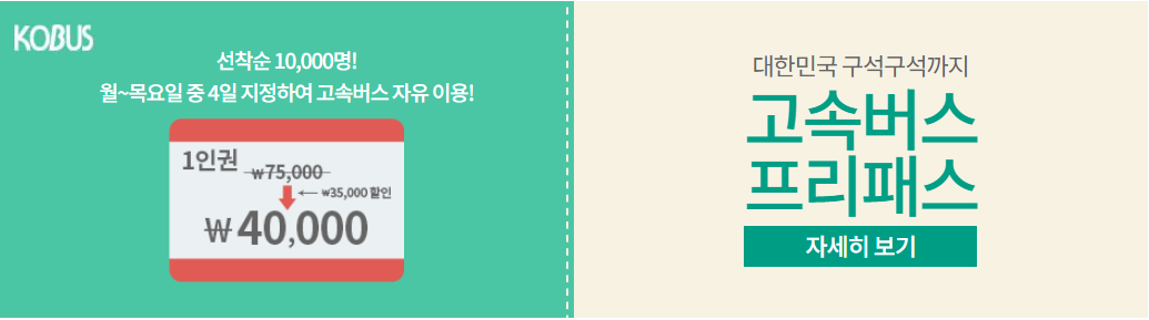 월~목요일 중 4일을 지정하여 고속버스를 자유롭게 이용할 수 있는 패스권을 4만원으로 할인해주고 있습니다.